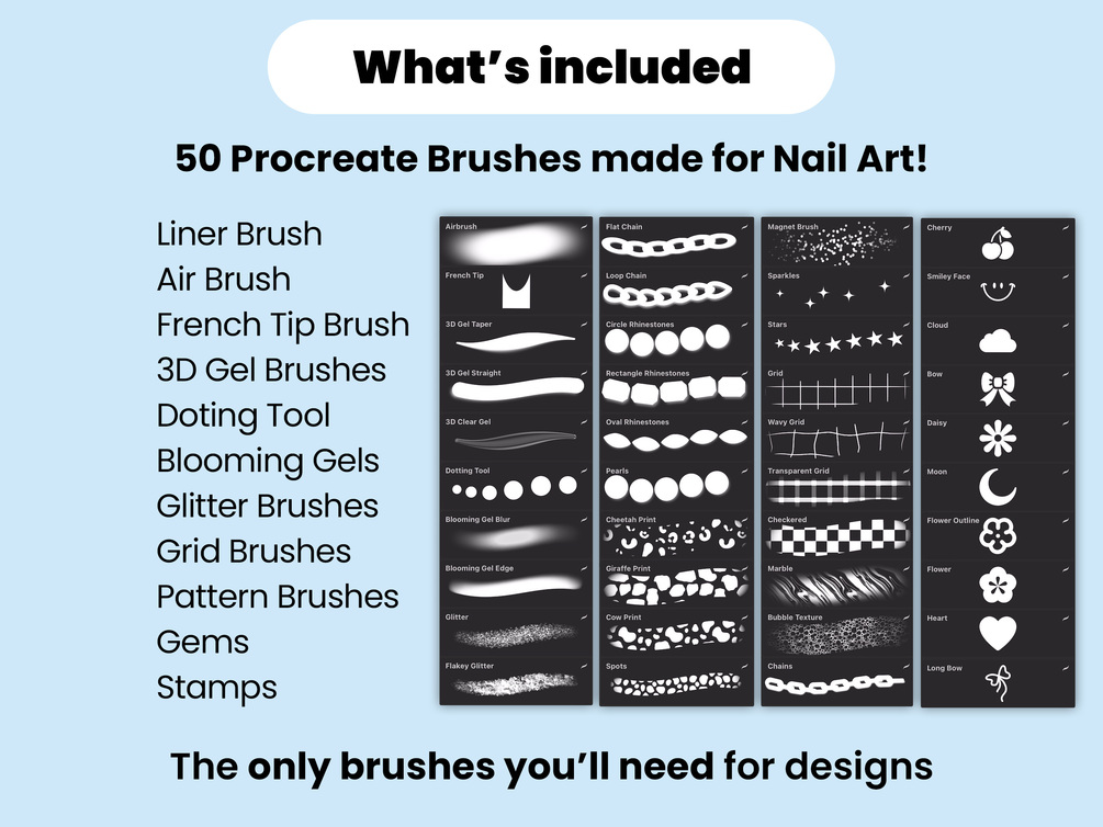 ✔ 50 high-quality Procreate brushes for detailed nail art design